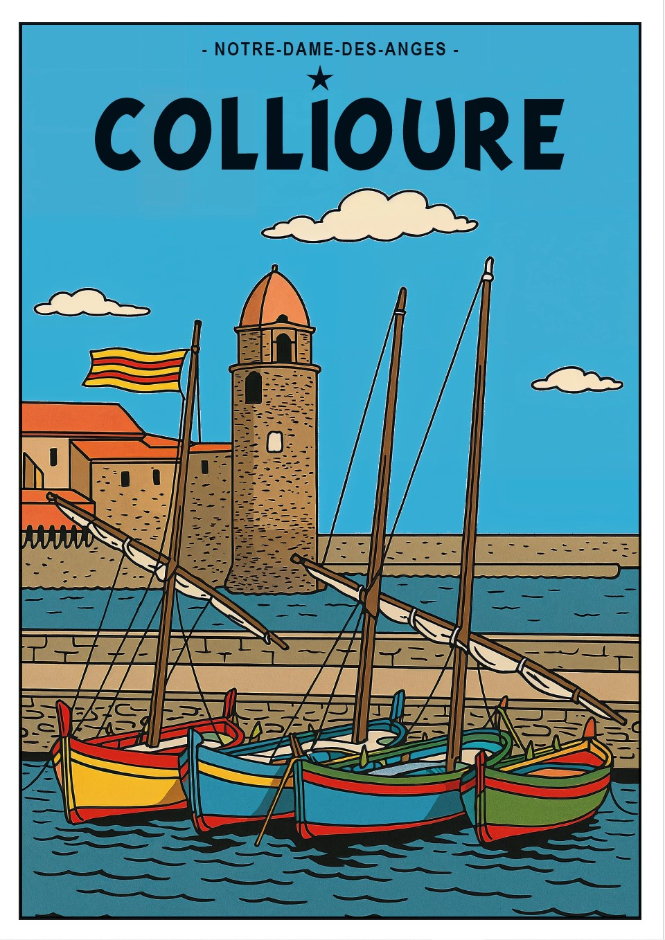 COLLIOURE style illustration vintage, les barques catalanes, Église Notre-Dame-des-Anges