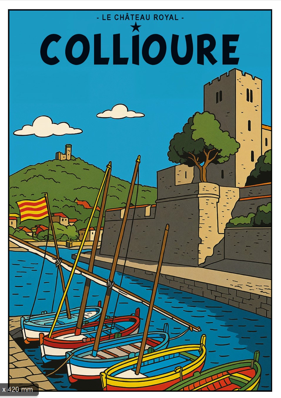 COLLIOURE, style BD, église, fort royal et barques