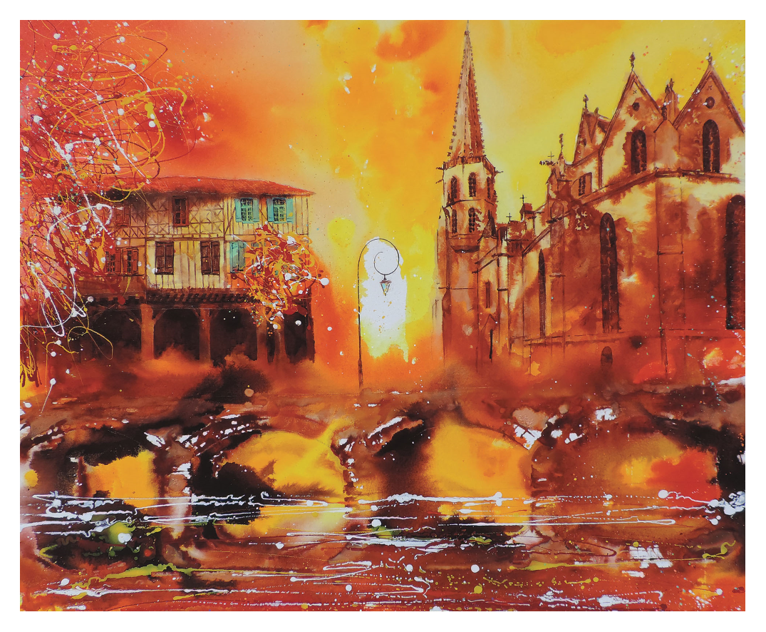 MIREPOIX style peinture, couverts, cathédrale et pont